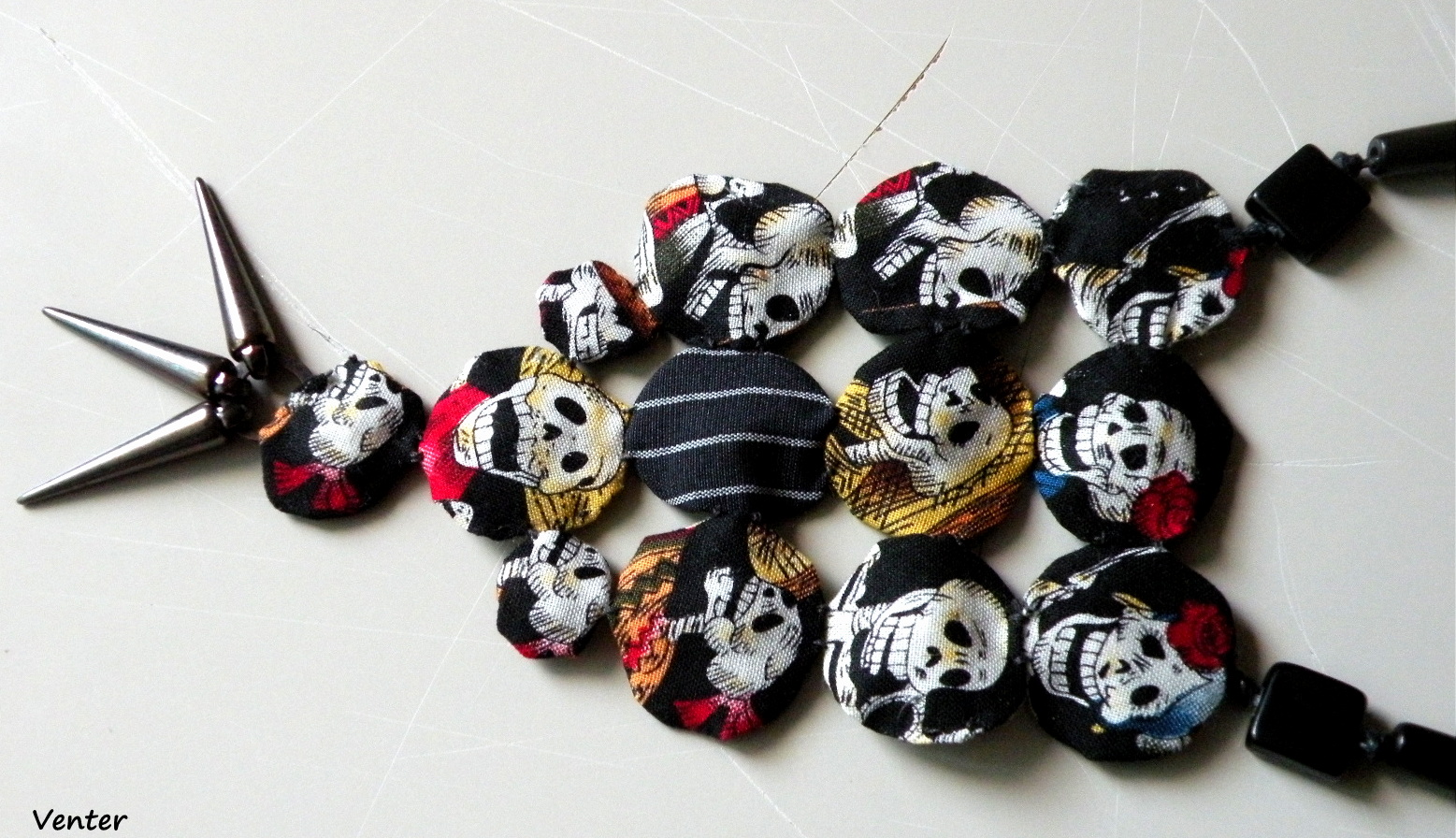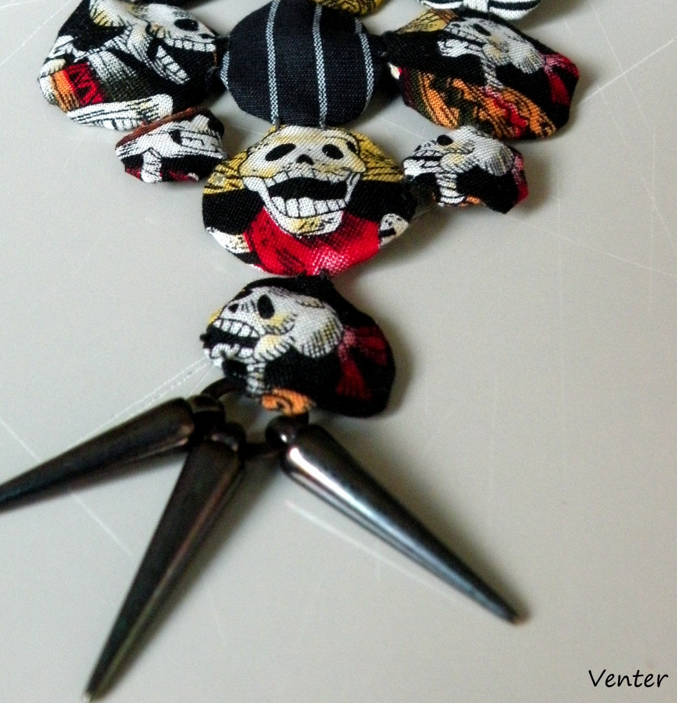 En esta ocasión elaboré un collar en tela de algodón, con la técnica de fuxico y con alegoría a las calaveras, al que agregué unas púas para darle el toque roquero con el cual me identifico.