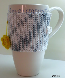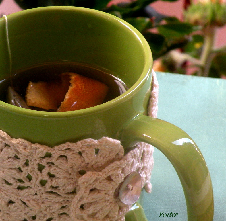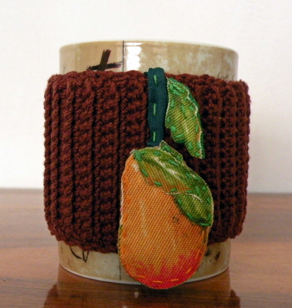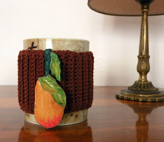 El cubre tazas lo he elaborado en punto bajo tejido en relieve. Recorté de un mantel plástico ( de los de la cocina), una pera y sus hojas, seguidamente corte las mismas figuras en fieltro y las he pespunteado para que de esta forma queden fijas e igualmente adquieran volumen.