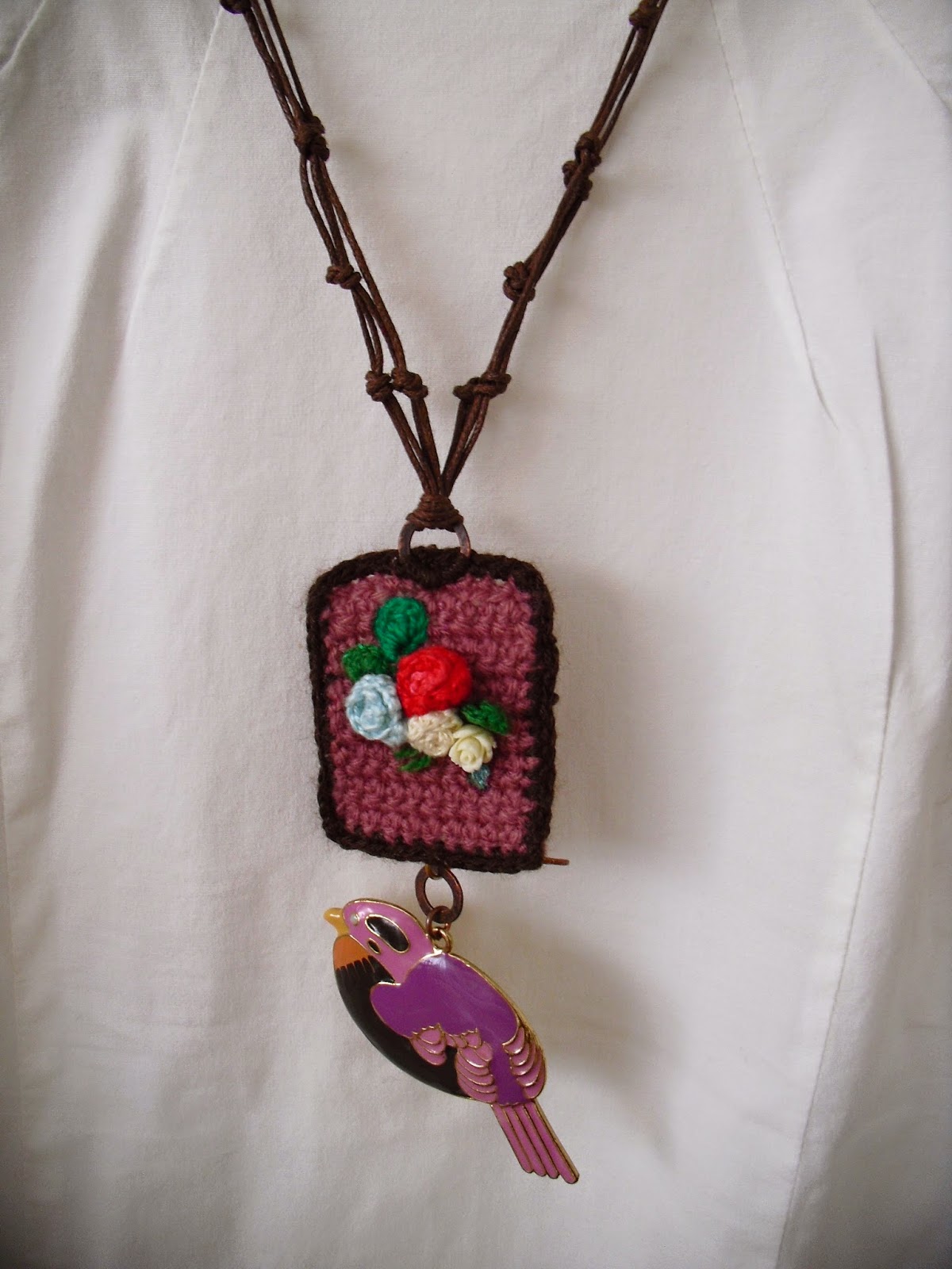 COLLAR CON FLORES DE GANCHILLO Y PÁJARO.